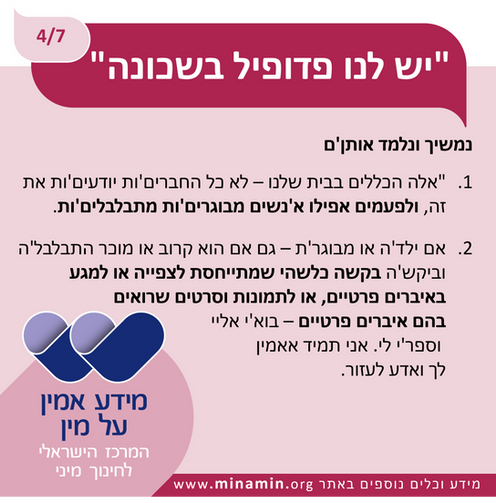 רוב הפגיעות המיניות לצערנו מתרחשות על ידי אדם מוכר וקרוב לילד/ה. זה לא אומר שאין סכנות גם בחוץ - לפעמים אנחנו יודעים מהן, כי קיבלנו הודעה שפוגע חזר לגור בשכונה, לדוגמה, וברוב הפעמים אנחנו לא יודעים כי לצערינו אין לפדופילים ולפוגעים מינית קרניים, או אות קין על המצח.
